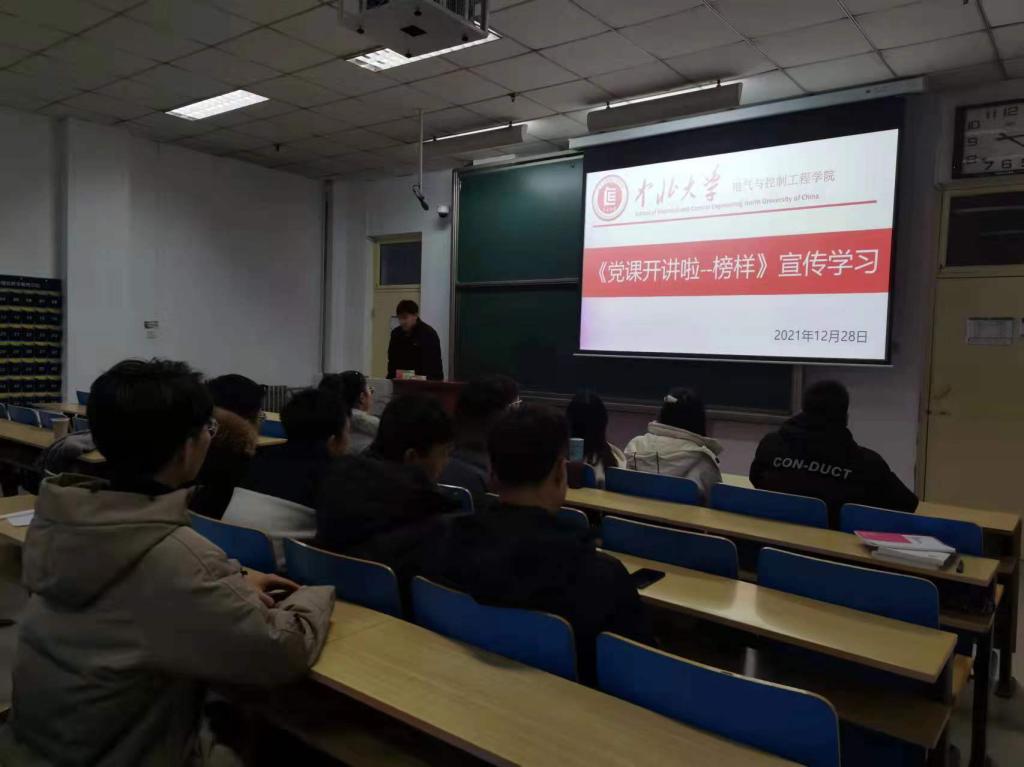 2021年12月28日下午在11111H教室,黄色电影 组织全体研究生会成员观看《党课开讲啦——榜样》第二期:《迎春花开》。
