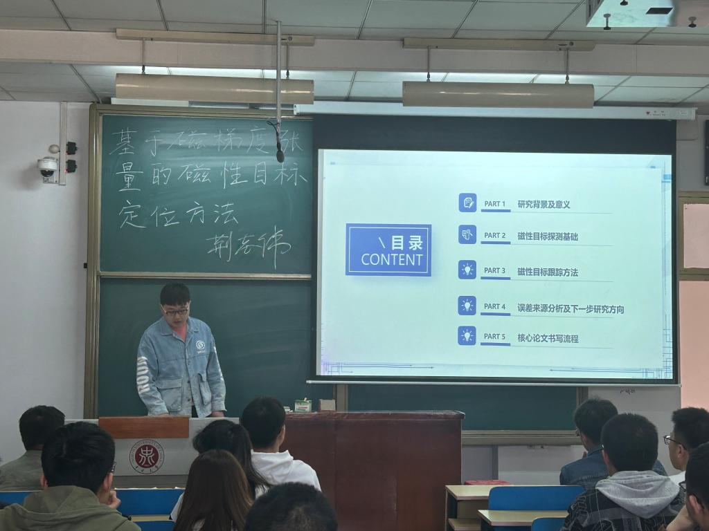 荆志伟同学首先介绍了磁性目标定位的现有技术,列举了五种目前广泛采用的磁性目标定位技术,并讲解了各自的特点与缺点;其次,关于磁梯度张量的磁性目标定位方法,荆志伟同学给大家讲解了磁梯度张度、磁偶极子模型、磁偶极子模型方程等相关知识,从环境磁场研究、构建新型传感器阵列并校准、仿真分析和试验验证四个过程介绍了研究的总体思路。最后,荆志伟同学根据自己发表多篇核心论文的经验向同学们分享了核心论文书写流程,鼓励大家努力学习,刻苦钻研,这样在未来的生活工作中才能拥有更多主动权。