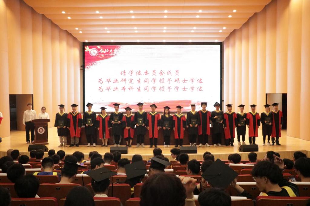 伴随着音乐,学位授予仪式开始。学位委员会委员依次为研究生、本科生学位获得者拨穗正冠,颁发学位证书,一一合影留念,在场的学子和前来观礼的家长共同见证了这一激动人心的时刻。