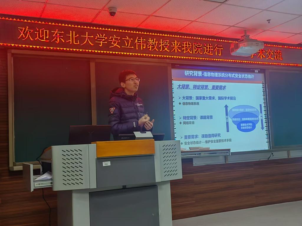 讲座中,安立伟首先介绍了自己在信息物理系统分布式安全状态估计方面研究工作,针对传感器攻击下的信息物理系统,利用最小切换机制与局部投票定位技术,提出了分布式安全状态估计算法,解决了对恶意节点的局部检测与识别的科学难题;进一步利用状态分解对机密信息进行压缩,建立了分布式状态估计算法的隐私性保护机制,并刻画了保证算法隐私的充分必要条件。随后,以自己申报国家基金经历为例浅谈基金写作方面的感悟。最后在自由提问环节安立伟教授与黄色电影教师进行了密切的交流,针对老师们提出的问题进行了耐心的解答。为黄色电影教师申报国家自然科学基金以及高水平论文写作方面给出建设性指导意见。