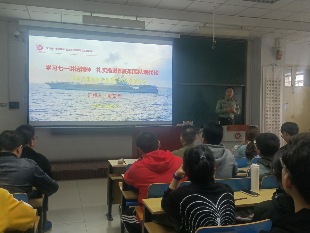 宣讲会上,蔺玄晋老师以中美大国竞争与军事对抗的风险挑战为主线,首先从党的百年党史看“强国必须强军”,讲述了我国从鸦片战争以后顽强求索到抗美援朝战争的艰苦卓绝,从国家初创的筚路蓝缕到“两弹一星”的攻坚克难,从百年未有之变局到中美大国竞争,指出世界正处于新旧格局转换、新旧秩序更迭、新旧体系更替的关键期。对习近平总书记“七一”讲话精神的“以史为鉴、开创未来,必须加快国防和军队现代化”进行了全面生动地解读。